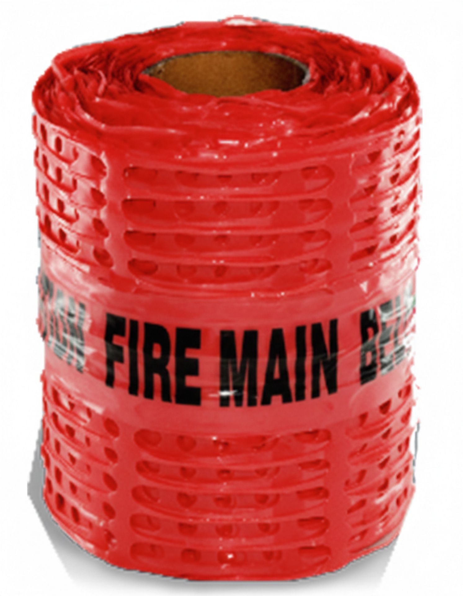This is a 200 mm wide × 100 m long Detectamesh® detectable underground warning mesh designed to mark the location of buried services such as fire mains. The mesh is made from durable coloured plastic (homopolymer polypropylene) with a stainless steel tracer wire embedded into the material. The printed warning message (Firemain Below) provides a highly visible alert to workers and equipment operators during excavation or groundworks.
