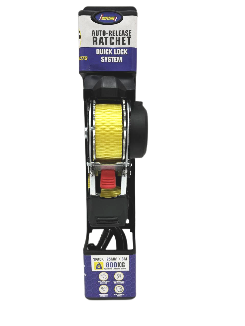 Full Description:The Auto-Release Ratchet Tie Down (TL435) combines strength with convenience, featuring a 25mm x 3m strap and an impressive 800 kg capacity. Engineered with an automatic release mechanism, it enables fast and effortless unloading without the need to manually disengage the ratchet. Its robust design ensures consistent tension and dependable load security, making it ideal for transporting heavy or bulky items. Supplied in a single pack, this ratchet tie down delivers both safety and efficiency, providing a reliable solution for everyday hauling tasks.