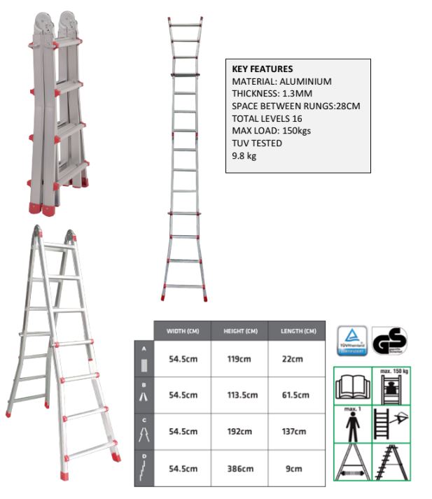 wide-flared legs, and the highest quality construction.MATERIAL: ALUMINIUM THICKNESS: 1.3MM SPACE BETWEEN RUNGS:28CM TOTAL LEVELS 16 MAX LOAD: 150kgs TUV Tested 9.8 kg