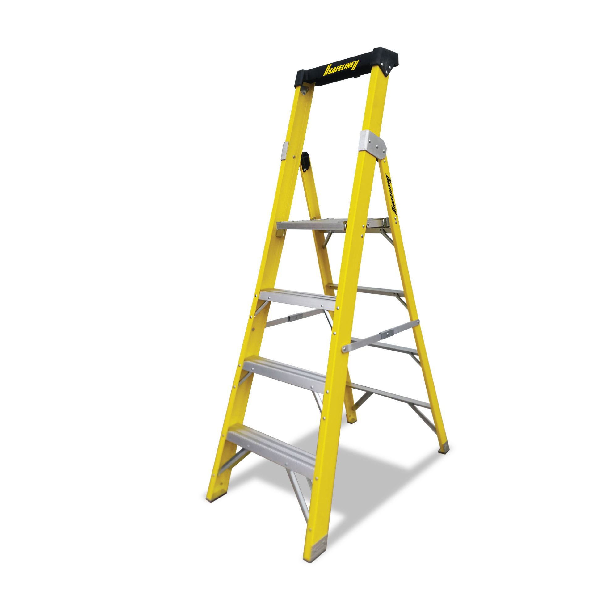 FIBREGLASS PLATFORM LADDER 3 TREADS + PLATFORMA sturdy, durable “Professionals” platform step platform Wide uprights for heavy users or unstable surfaces with safe and secure non-slip access platform. Available in 4, 6 ,8 and 10 tread sizes,Conforming with European Standard EN131 - 150kg load. Open size: 495x950x1565mm Close Size: 495x950x1685mmEN131-1