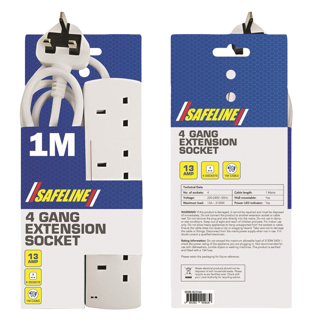 The EL2146 4-Way Extension Lead is a practical and safe power solution designed to extend a single outlet into four usable sockets. Equipped with a 1-meter cable and a 13-amp fused plug, it can support a total load of up to 3120W, making it ideal for everyday household and office appliances.